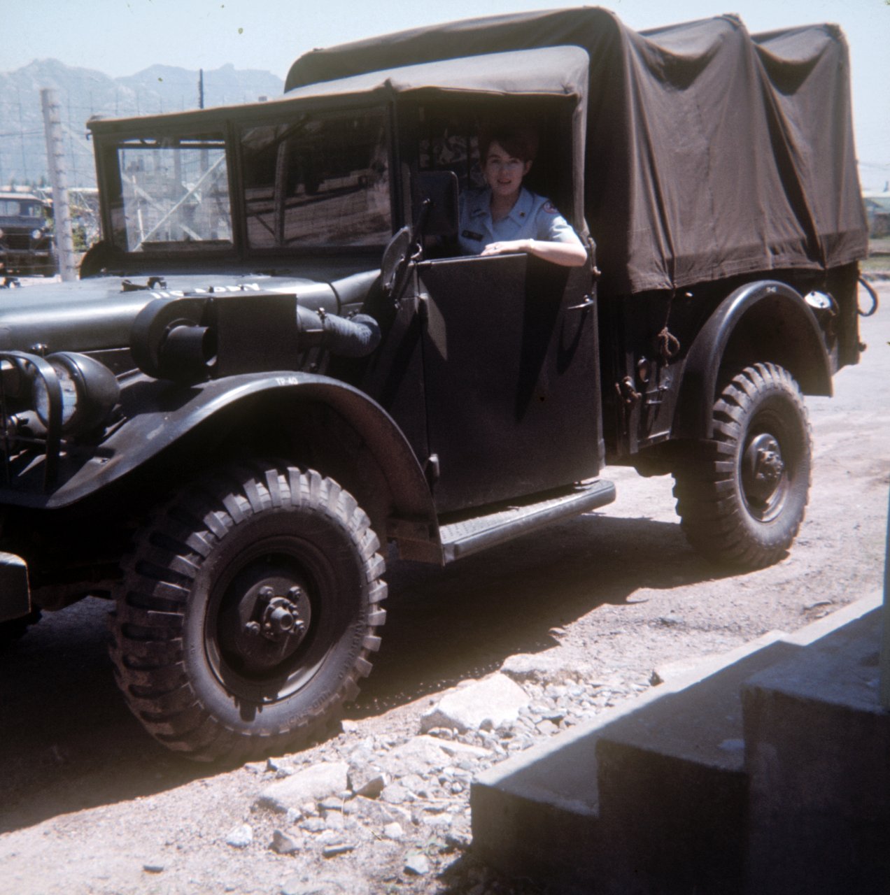 Linda Jones in a U.S. Army three quarter ton truck, circa 1969.
