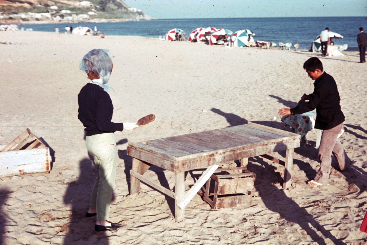 Linda Jones is seen here, on left, playing pingpong on the beach at Pusan, South Korea, in 1969.